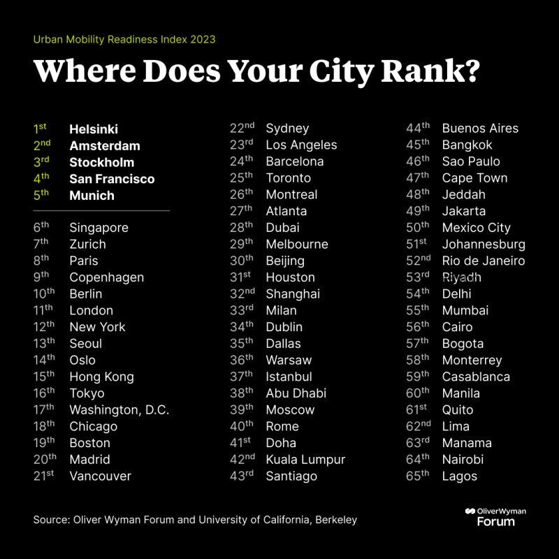 2024 Urban Mobility Readiness Index, a ranking of 70 major cities worldwide on their preparedness for mobility’s next chapter. For its sixth edition, the index introduces a new sub-index focusing on technology adoption alongside customized actionable recommendations for each city.