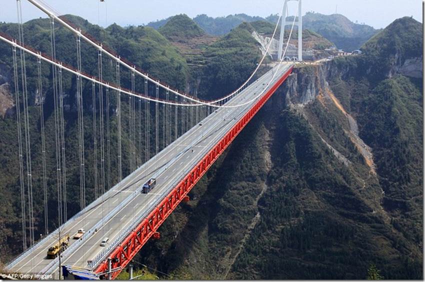 Aizhai Bridge in Hunan province is 336 m high and has a 1,176 m span. It connects two traffic tunnels in the mountains, cutting the time needed to traverse the canyon from 30 minutes to 1 minute.