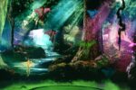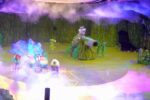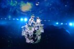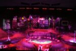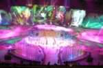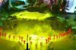 Five LED screens around the stage create the different vivid backdrops for the show, such as cascading waterfalls and a scene of a metropolis.