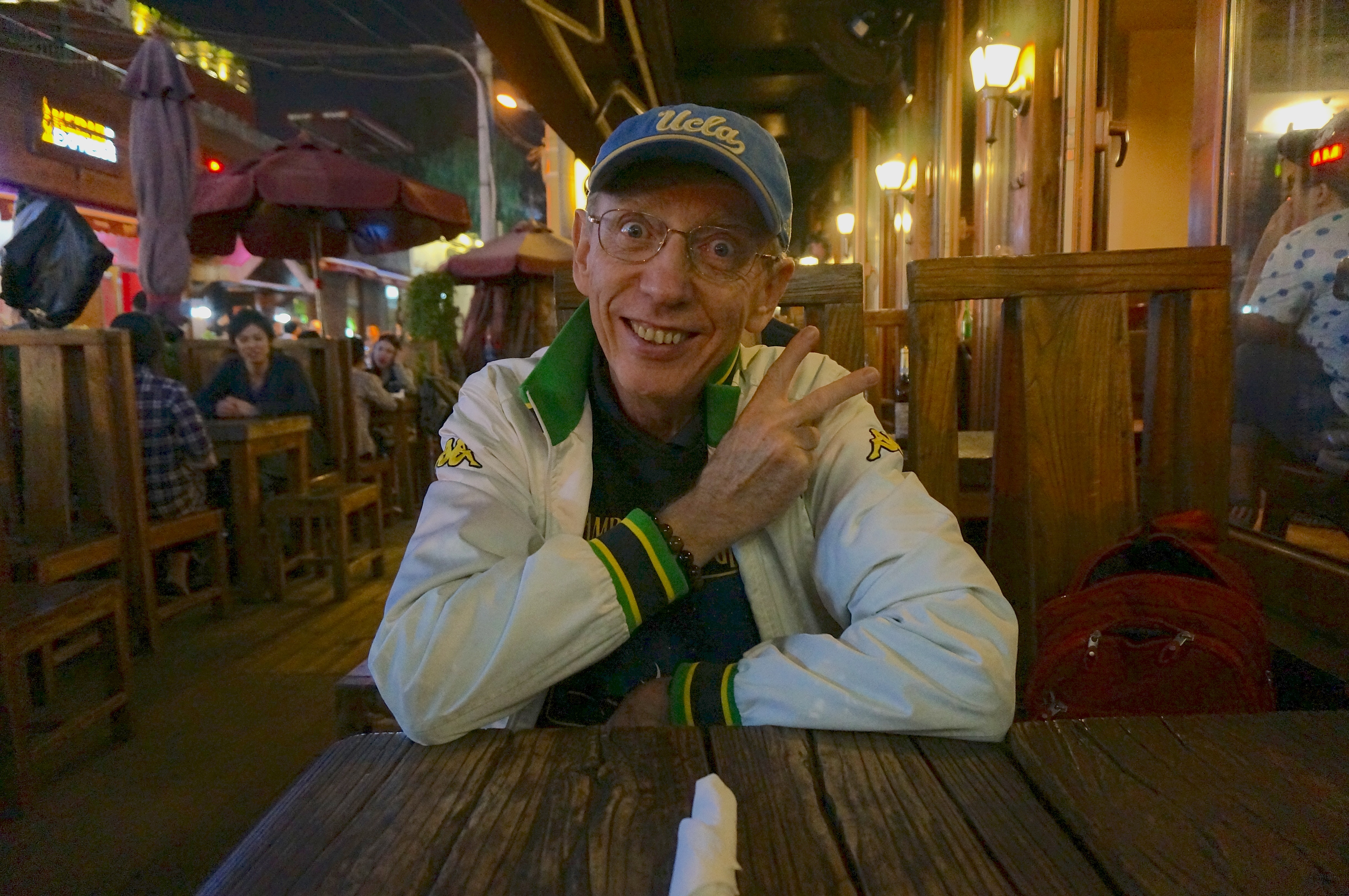 I limit myself to the safe area of Sanlitun. See a typical laowai tourist self-portrait in First Floor (good hamburgers and more).