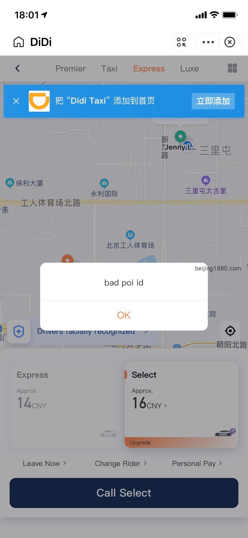 – through the Alipay app: problem, all in Chinese. Then it also did not to work well for me, getting strange error codes like “bad pol id”. Ugh… Selecting a more expensive ride than seemed to work but without the easy use of the original English Didi app;