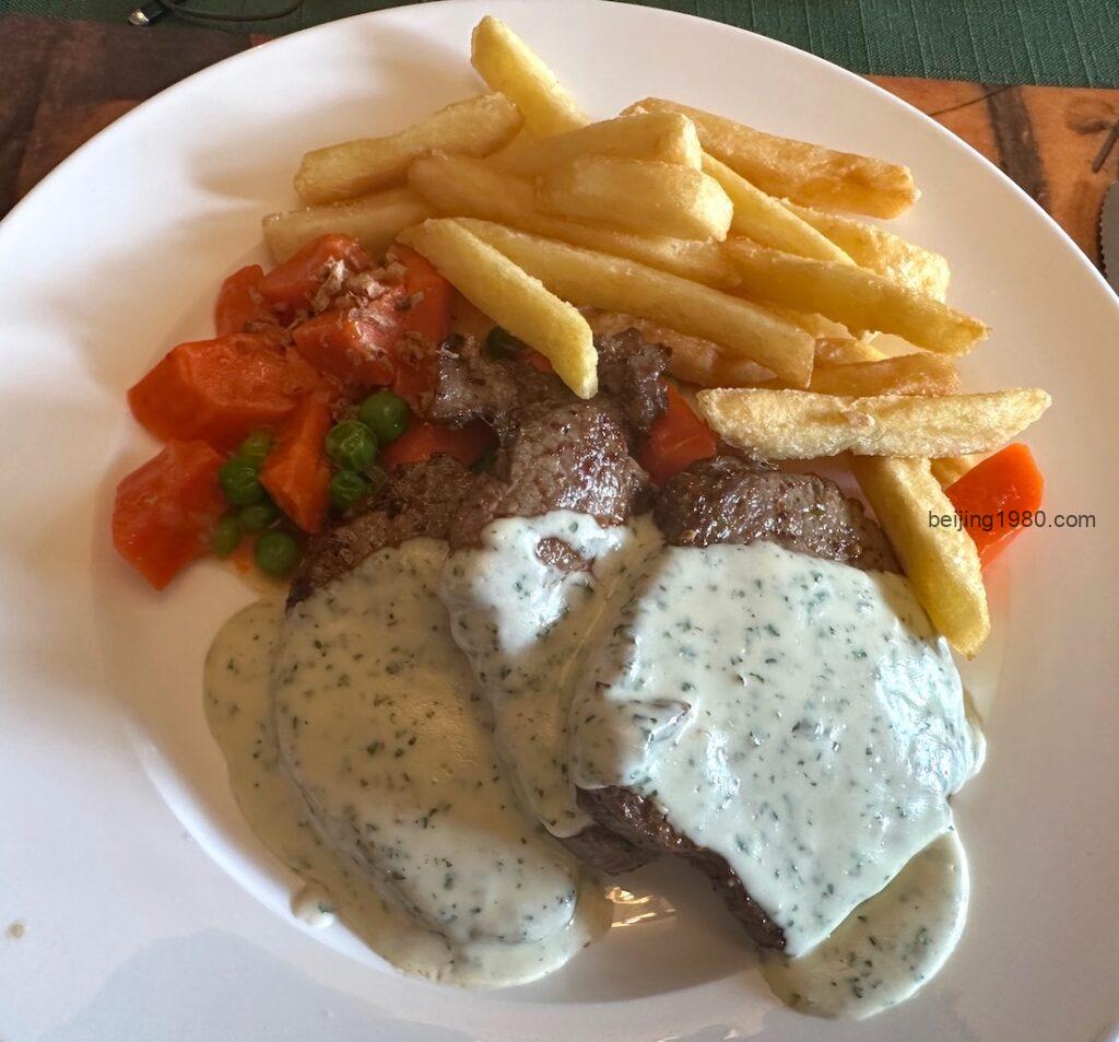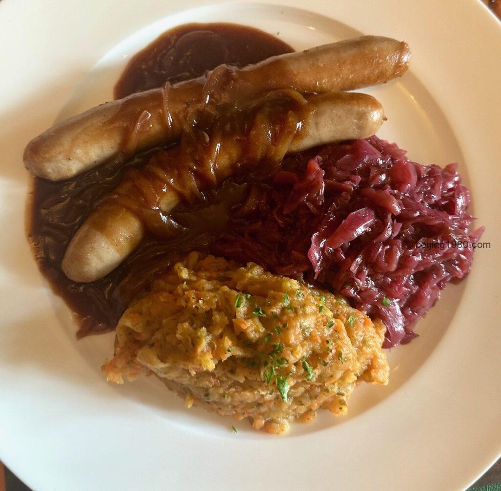- farmer’s pork sausage with onion sauce served with red cabbage and hotchpotch potatoes OR mini steak minute with blue cheese sauce served with daily vegetables and french fries OR pan-fried snapper with mustard sauce served with daily vegetables and mashed potatoes
