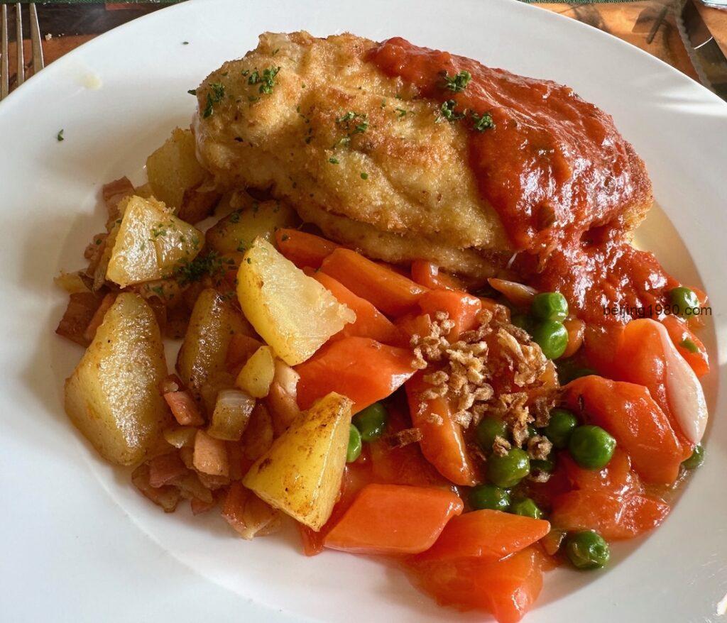 - farmers pork sausage with onion sauce served with cabbage and roesti potatoes OR chicken cordon blue served with daily vegetables and pan-fried potatoes OR red snapper Meunière served with daily vegetable and boiled potatoes