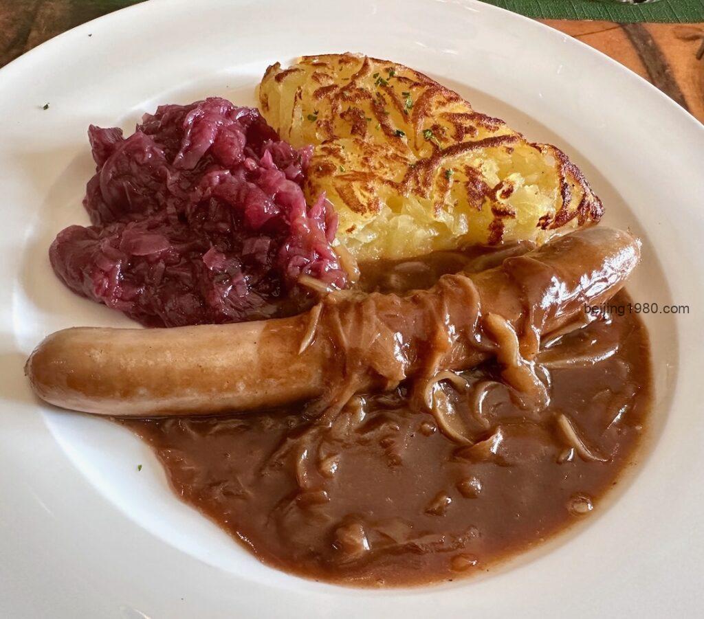 - farmers pork sausage with onion sauce served with cabbage and roesti potatoes OR chicken cordon blue served with daily vegetables and pan-fried potatoes OR red snapper Meunière served with daily vegetable and boiled potatoes