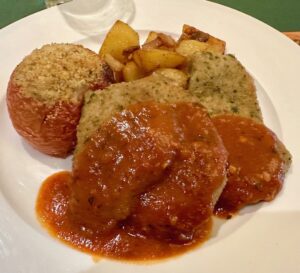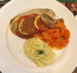 - pork piccata provençale style served with grilled tomato and pan-fried potatoes OR beef tenderloin Stroganoff served with market vegetables and steamed rice OR red snapper Provençale style served with vegetables and mashed potatoes