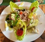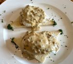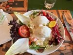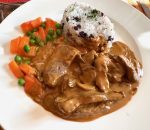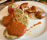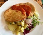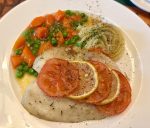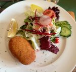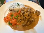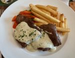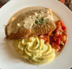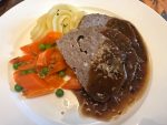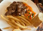 - veal sausage with curry sauce served with salad and Belgian fries OR sliced roast beef with gravy served with cauliflower and pan fried potatoes OR pan-fried snapper Meunière served with daily vegetables and boiled potatoes